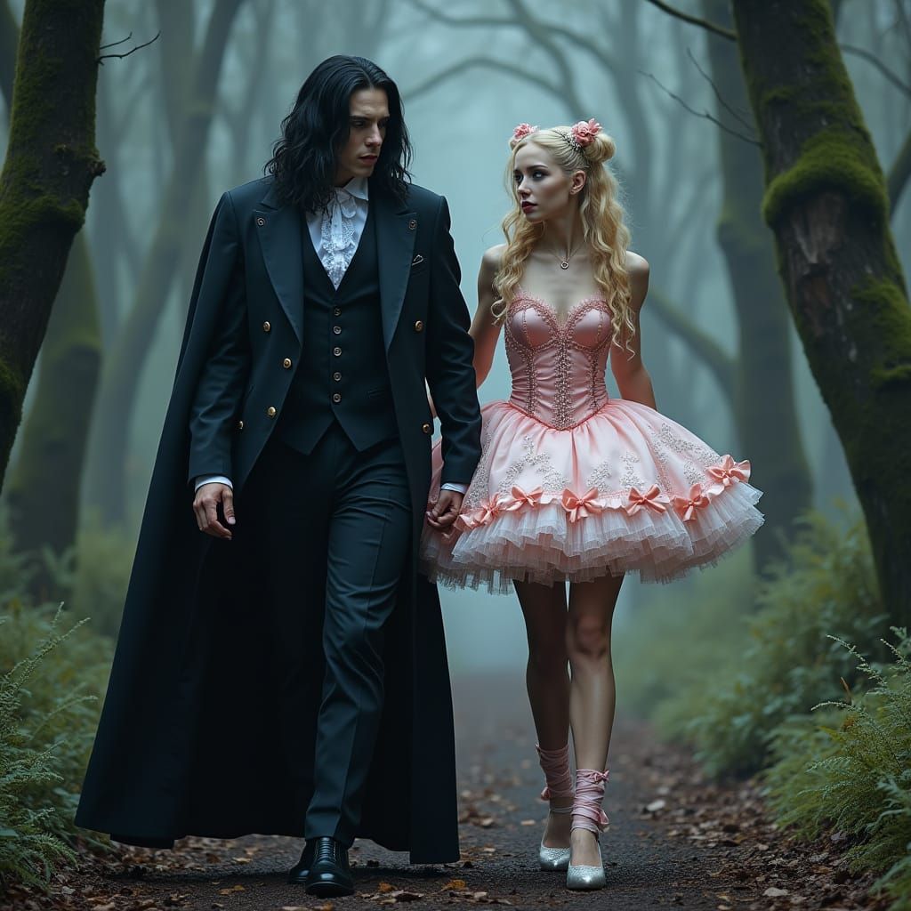 This image shows a vampire king escorting a human woman through a mystical forest. The artwork features synthwave neon retro elements and a dark, enchanted atmosphere, realized as digital art.