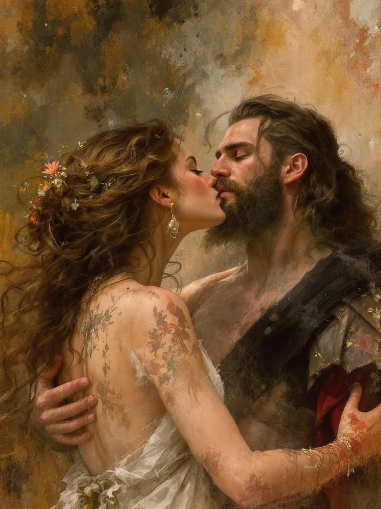 This image depicts a Viking warrior adorned with a flower crown, rendered in an oil painting style with atmospheric textures and soft edges, blending smooth and visible brushwork.