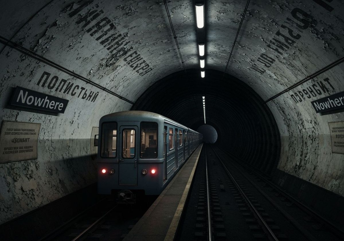 This image shows a Moscow subway train speeding through a derelict station toward a dark tunnel. The scene evokes urban decay with peeling paint, faded text, and a melancholic color palette, reminiscent of oil paintings.
