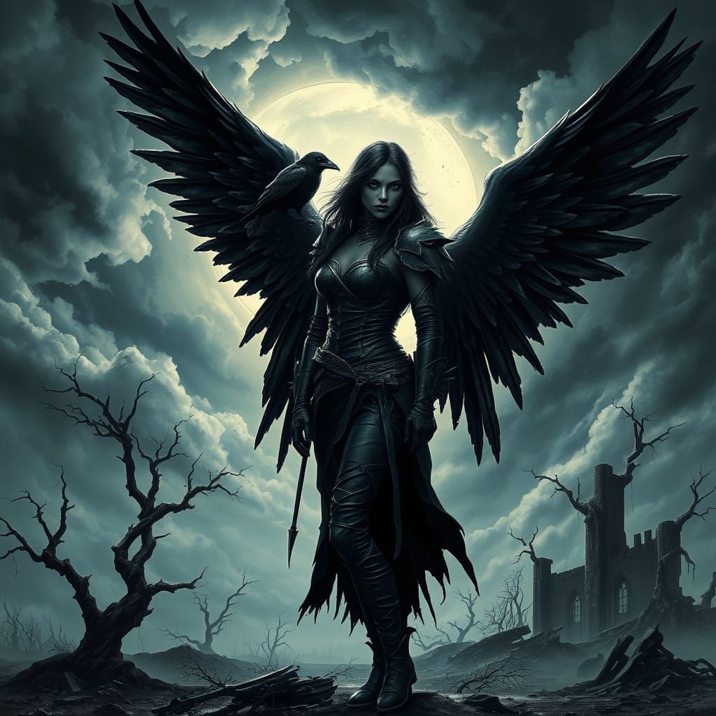 A striking picture of a dark angel silhouetted against a stormy sky with her raven. She wears tattered leather armor in a desolate wasteland, rendered in a dark fantasy style.
