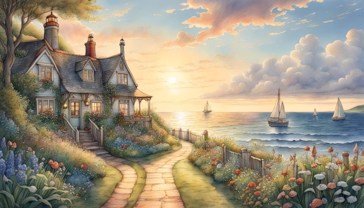 This image shows a pencil drawing in the style of Brambley Hedge, depicting a beautiful seaside cottage garden with a sea view, lighthouse, and sailboats. The illustration is idyllic, detailed, and intricate.