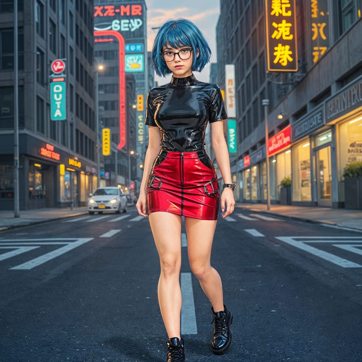 A striking picture of a young woman in a futuristic goth-cyberpunk latex outfit, posing on a city street with neon lights reflecting off her bold fashion statement.