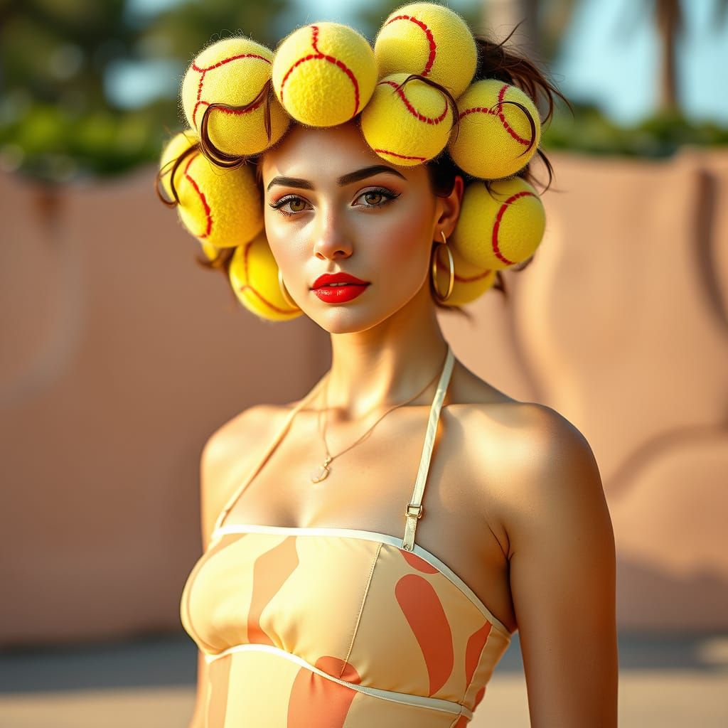 A portrait of a young woman with tennis balls for hair, wearing a vibrant pop art dress and bikini. This fashion-editorial style image features vivid, panoramic pop colors.
