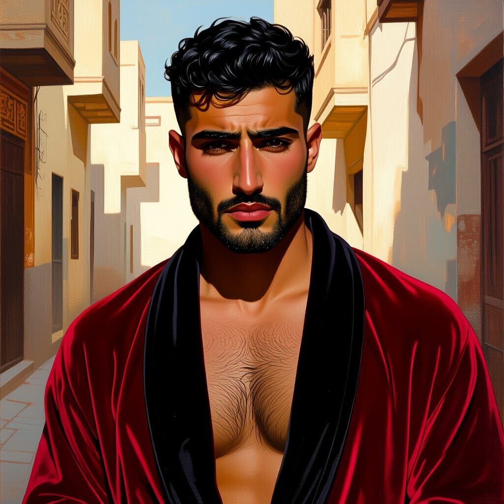 A striking picture of a handsome, sad man in a red velvet robe, standing on a rundown city street. The image is rendered as an impasto oil painting with vibrant colors and dynamic lighting.