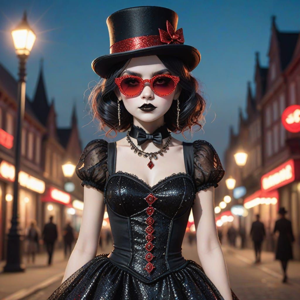 This image shows a gothic doll that has come to life wearing a glittery dress, sunglasses, and top hat. The scene is set at night, rendered as digital art.