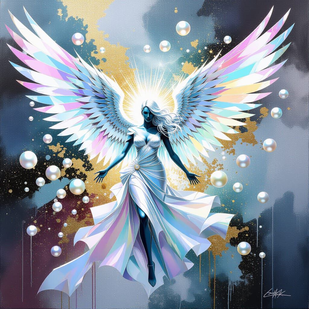 A digital rendering of a shattered angel transforming into a diamond. The artwork blends graffiti and splash art styles in a surreal explosion of mother-of-pearl colors, gold, and silver.