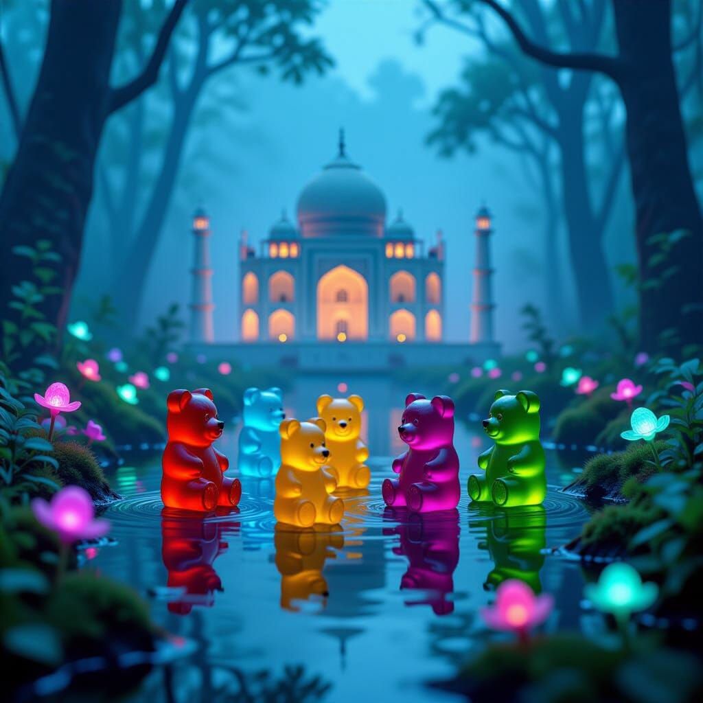 A vibrant image of dew-covered gummy bears in a misty forest. Bioluminescent candy plants and colorful creatures surround a miniature Taj Mahal, in a style reminiscent of detailed illustrations and surreal digital art.