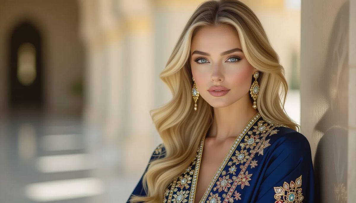 A striking picture of a blonde business woman in a luxurious setting. The woman wears a modern, jewel-toned abaya featuring intricate embroidery and precious gemstone accents in a haute couture style.