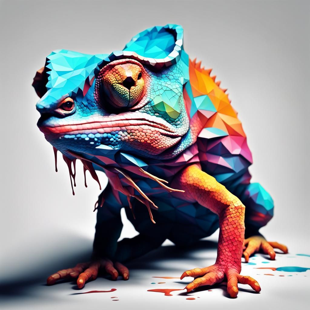 A striking picture of a chameleon rendered in a low poly style. The digital artwork features ultra-fine details, dramatic lighting, and a black background, creating a fantastical 3D effect with deep colors.