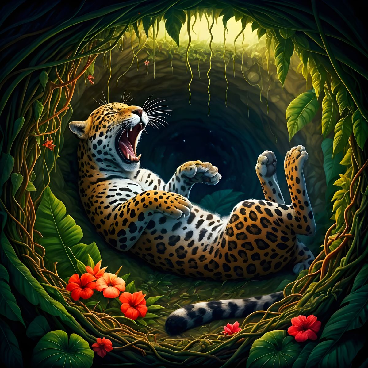 This image shows a detailed illustration of a jaguar yawning comfortably in a jungle cave, surrounded by vines and flowers. Rendered in acrylic inks with accurate anatomy.