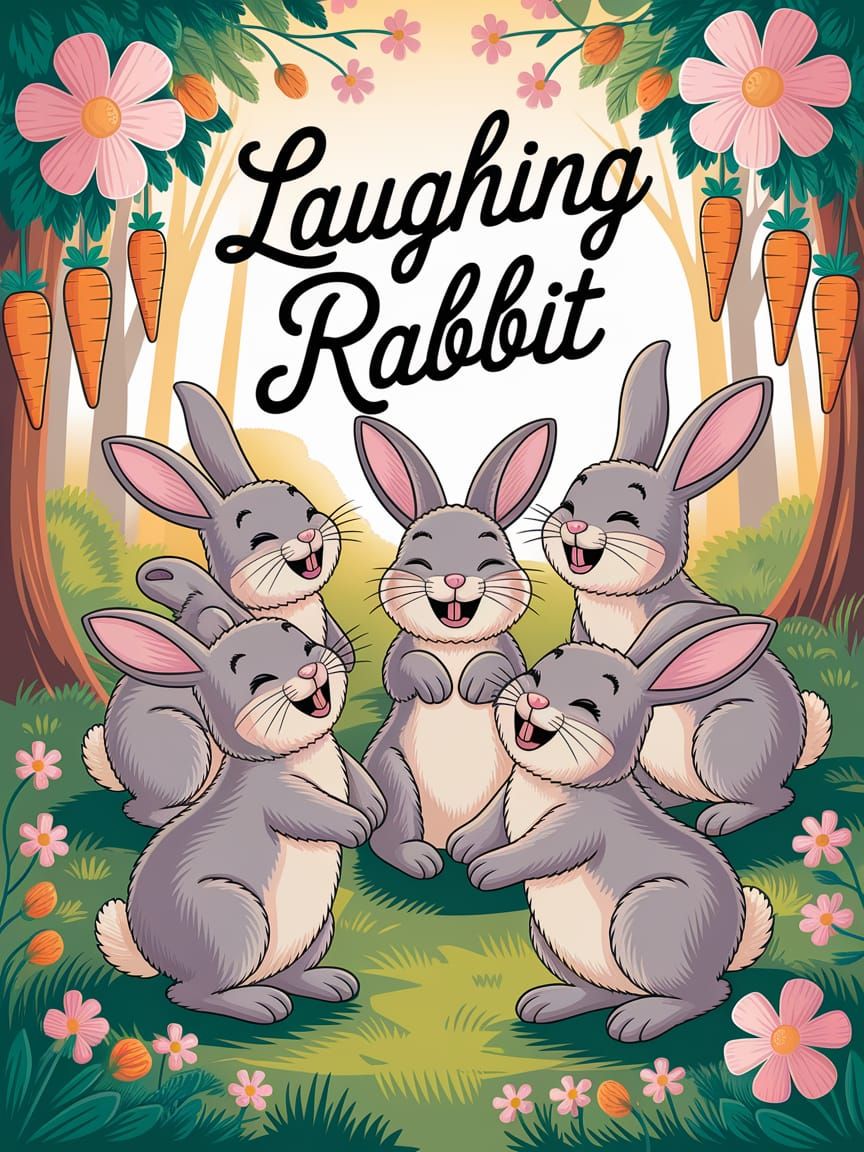 This image shows a Beatrix Potter-style illustration of several laughing bunnies in a forest clearing. The illustration features soft lighting, lush greenery and vibrant flowers, creating a cozy woodland scene.