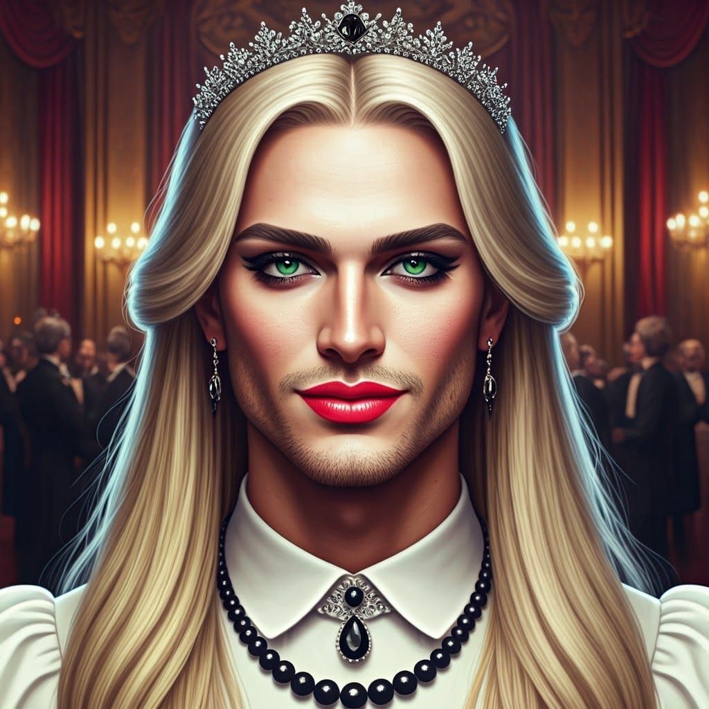 This hyperrealistic image shows a masculine man with blond hair and green eyes wearing a peter pan collar dress and wedding crown in a ballroom. Features dramatic lighting and cinematic detail.