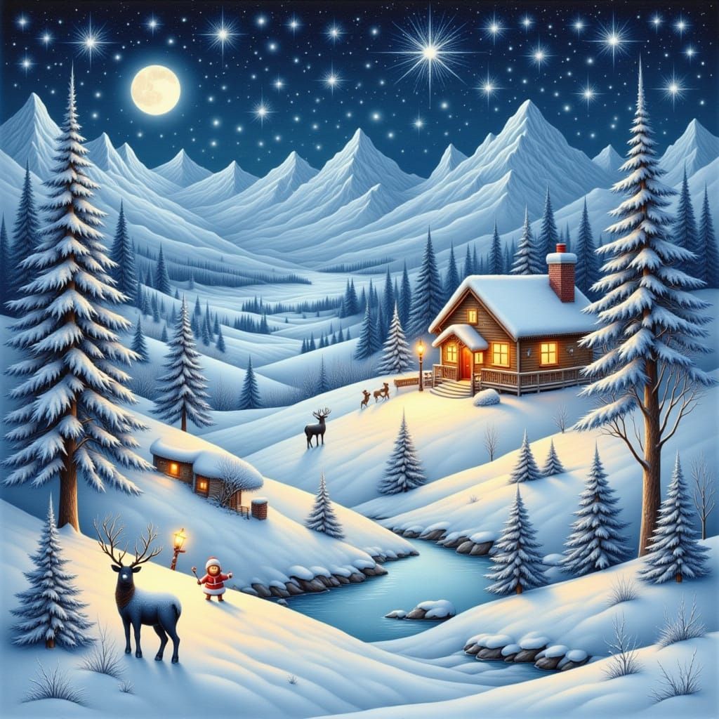 This image depicts a magical twilight scene at the North Pole, featuring Santa's workshop nestled among snow-covered plains and icy mountains. The artwork uses soft, blended ink textures with cool colors and glittery accents for a whimsical, festive atmosphere.