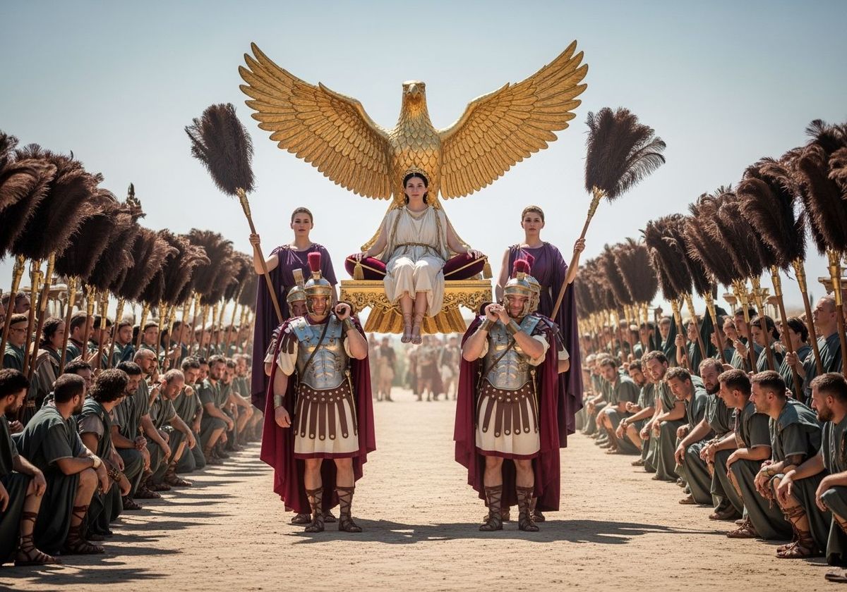 This image shows a Roman Empress being carried on a golden eagle throne by soldiers. She is attended by servants and followed by kneeling peasants in a scene of imperial grandeur captured in sharp focus.