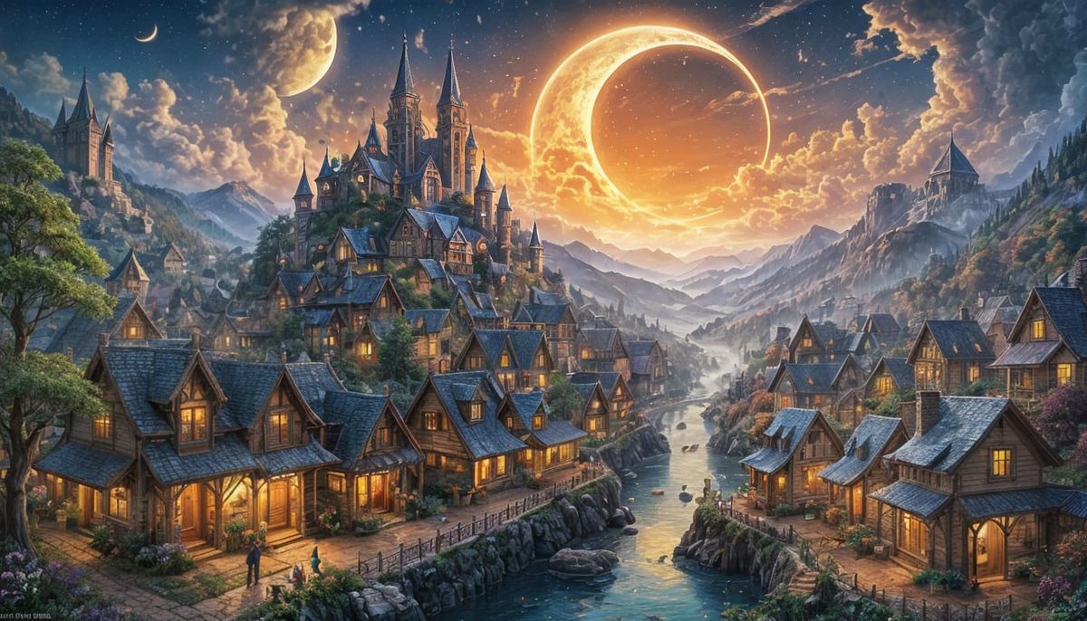 This image shows a village nestled within a giant crescent moon. Rendered as a highly detailed digital painting, the artwork features soft golden lighting and a dreamy, ethereal atmosphere.