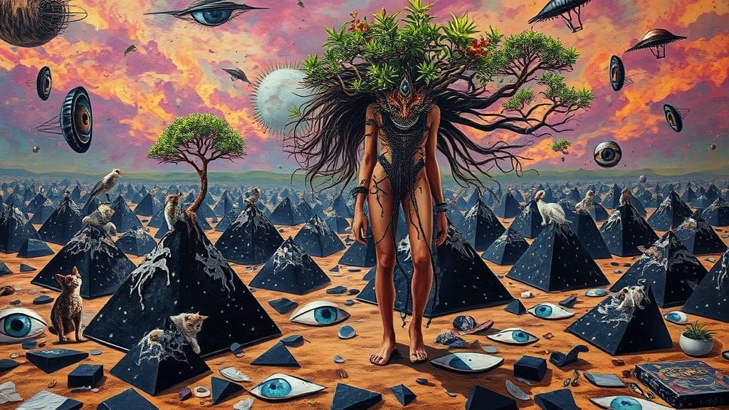 This surreal artwork features a woman composed of vibrant, hyperdetailed Suri tribe patterns, walking on pyramids with micro plants, surrounded by a dreamlike atmosphere. Inspired by Yayoi Kusama's ethereal landscapes, the piece blends surrealism with intricate dots patterns and vibrant colors, evoking a...