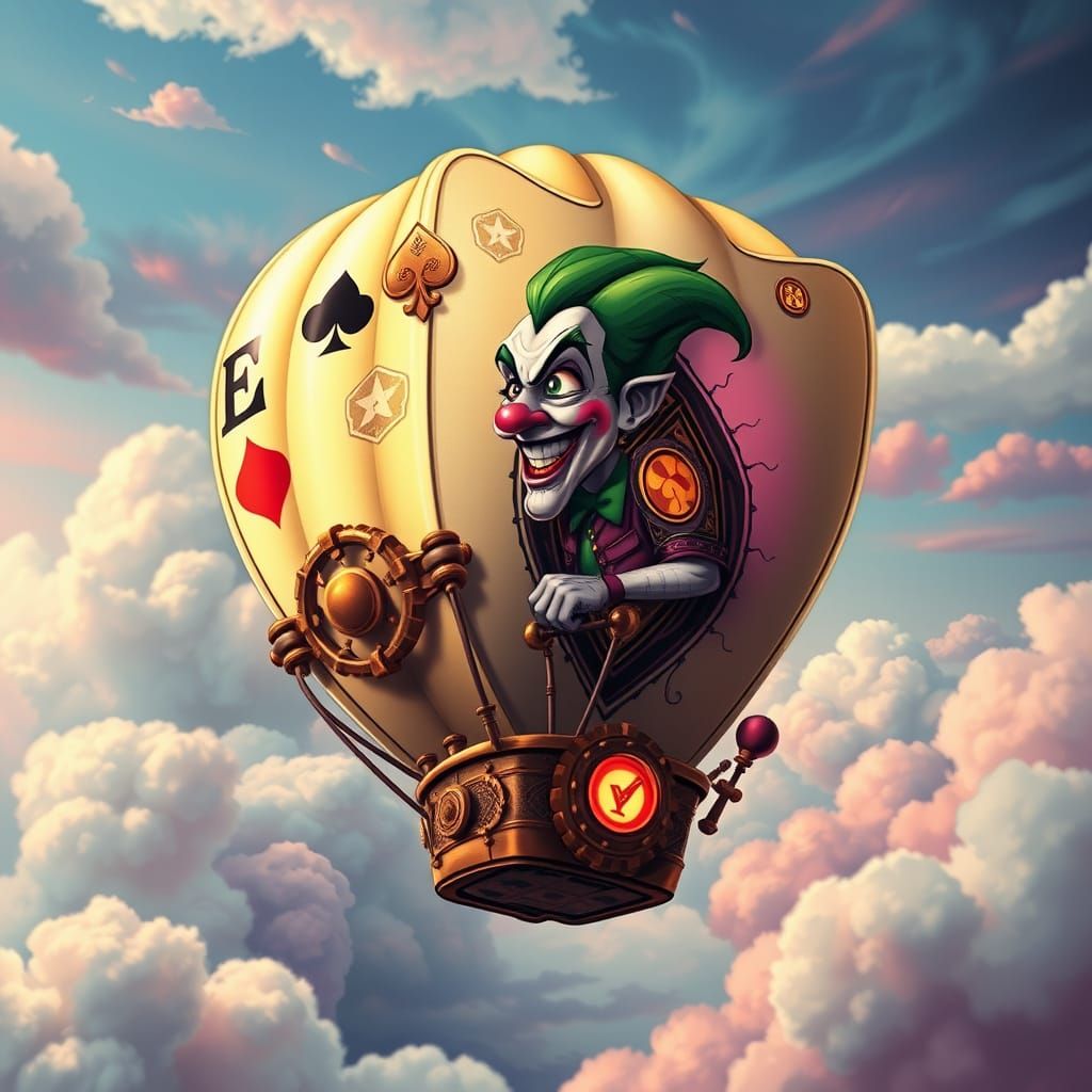 This image showcases a whimsical, steampunk hot air balloon shaped like an ornate Ace of Spades, floating in a vibrant, candy-colored sky. It features intricate gears and glowing patterns, piloted by a Joker figure, in a style blending pop art and surrealism.