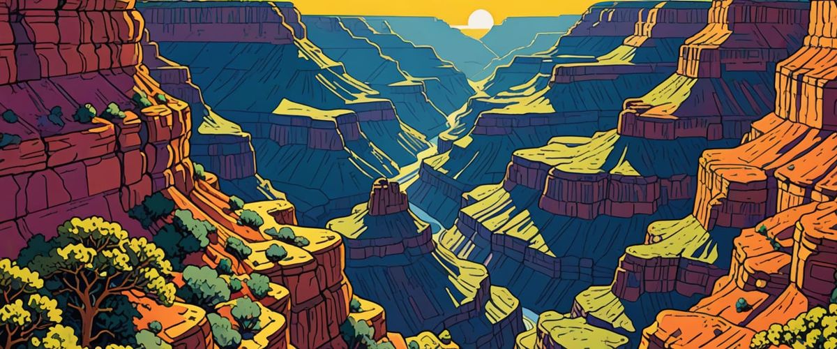 This graphic art piece is a retro 1950s travel poster of the Grand Canyon, rendered in gouache and watercolor with bold lines and deep shadows.
