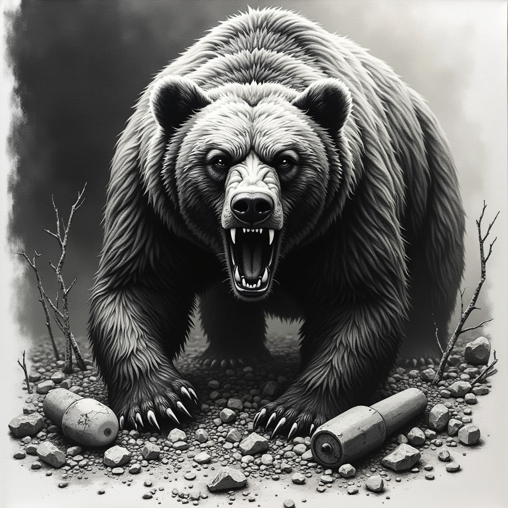 A close-up of a snarling bear's face, set amidst a gritty, trash-filled environment, with bold black and grey lines and heavy shading, evoking the dark realism of Paul Booth and the avant-garde feel of H.R. Giger's biomechanical art.