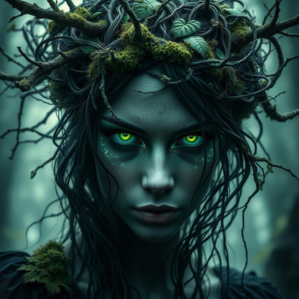 This image depicts a mystical woman with glowing dark green eyes, surrounded by an atmosphere of anticipation, as if the forest itself is holding its breath in reverence. Her wild, moss-covered hair and tree-bark skin blend seamlessly with nature, evoking a sense of ancient wisdom and mysticism.