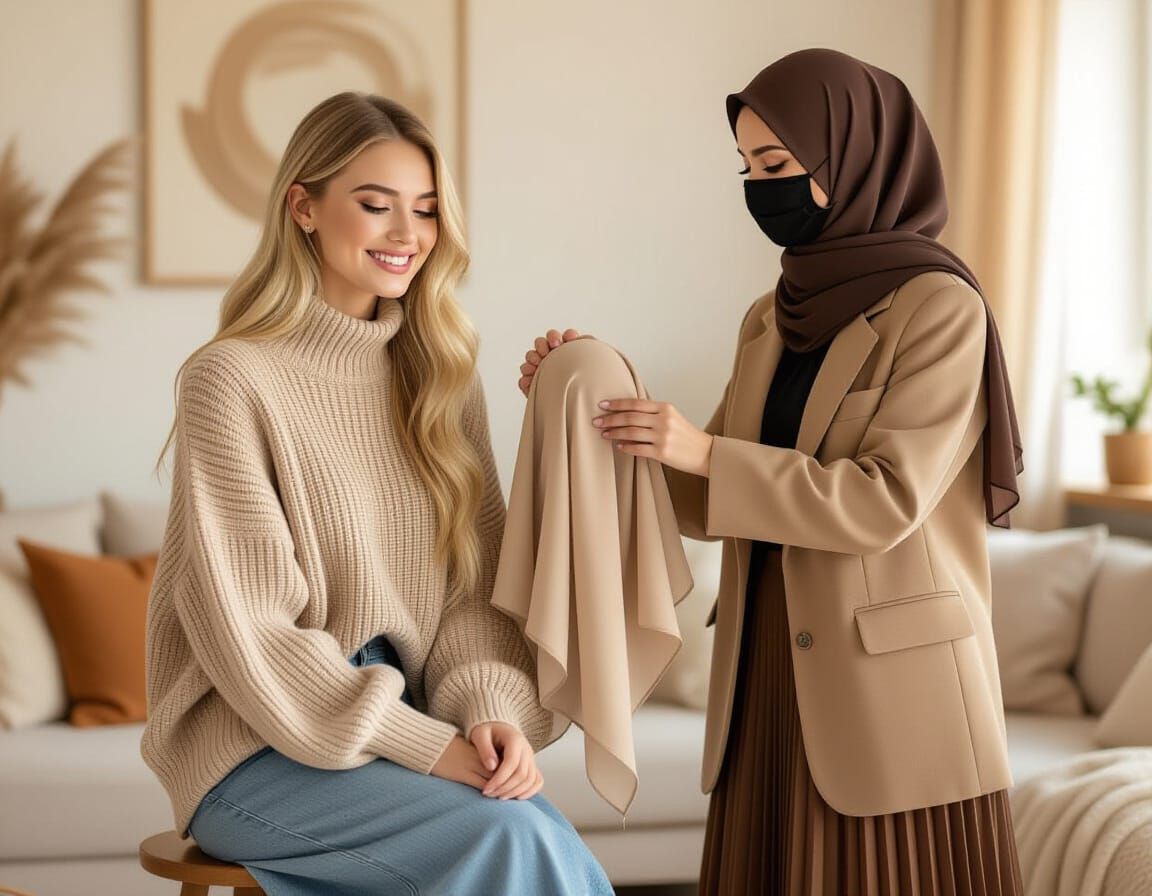 This image depicts a happy young blonde woman in a cozy living room, wearing a beige pullover and denim skirt. The style features soft brushstrokes and warm lighting, akin to modern illustration with a fine art touch.