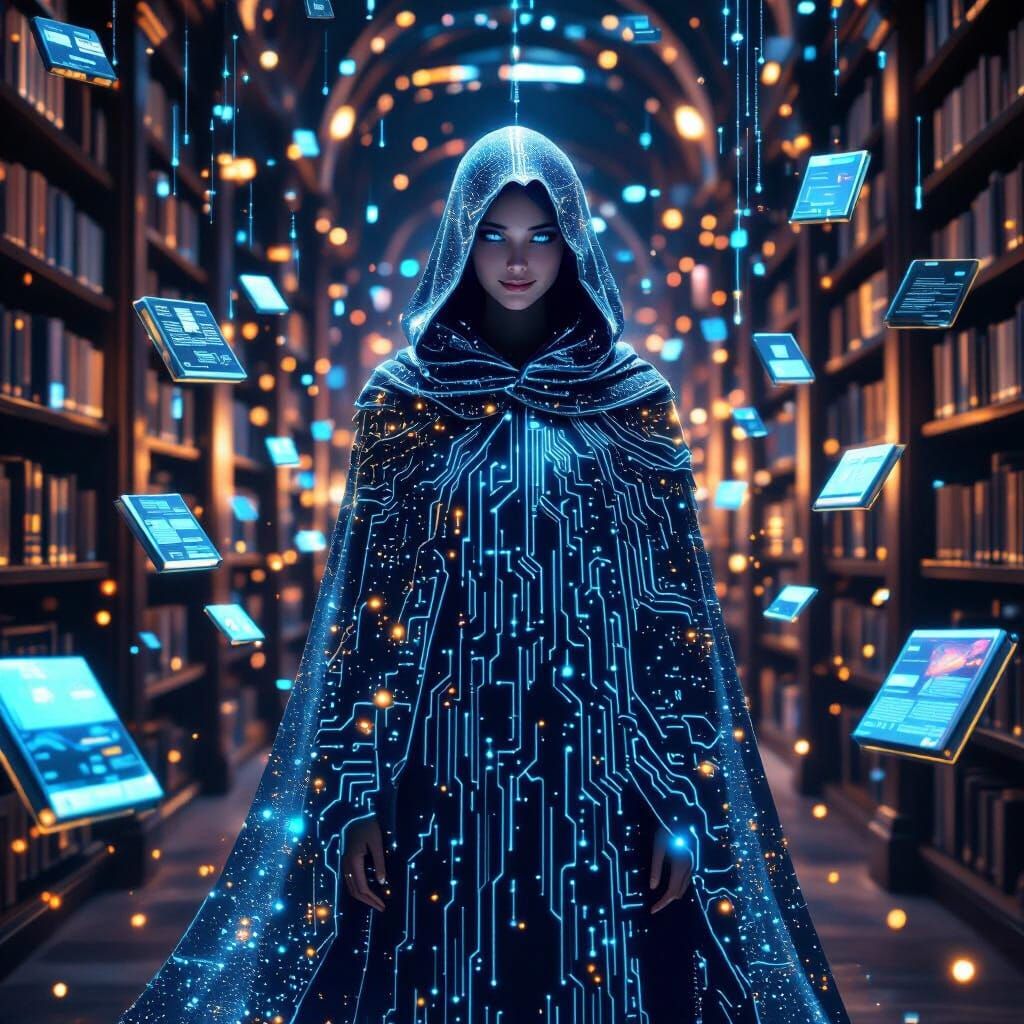 This image shows a genderless digital being composed of shimmering blue and gold light particles, set in a serene library with floating holographic books. The figure wears a hooded cloak with circuit patterns in a cyberpunk aesthetic.