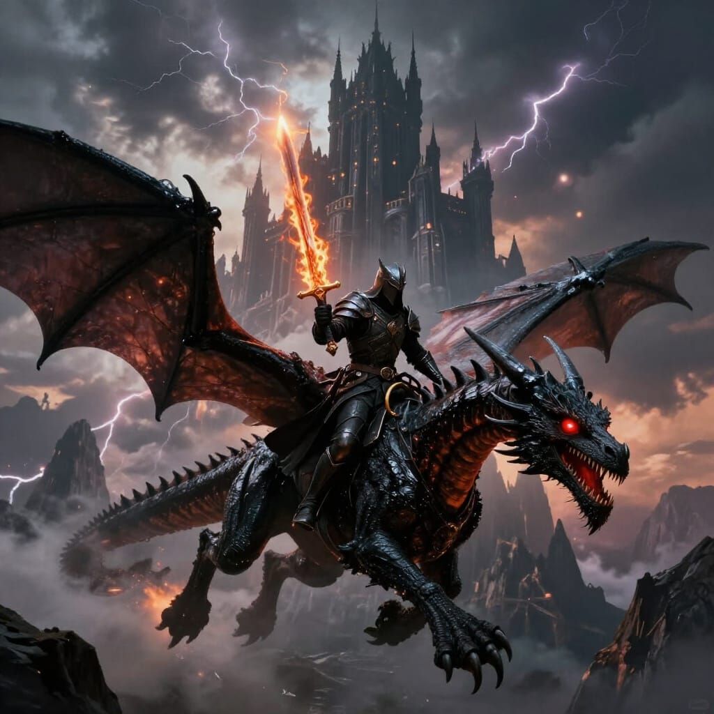 This epic fantasy artwork depicts a dark knight on a massive black dragon, flying through a stormy sky towards a colossal castle. Created in a hyperrealistic, cinematic style with dramatic lighting.