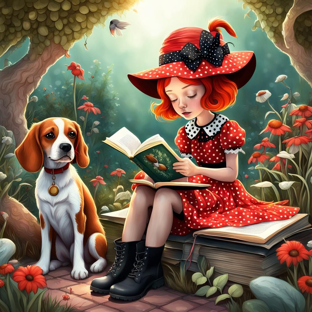 A cartoon image of a red-haired girl in a polka dot dress reading a book with her beagle in a magic garden. The art style is reminiscent of Pixar with airbrush and colored pencil textures.