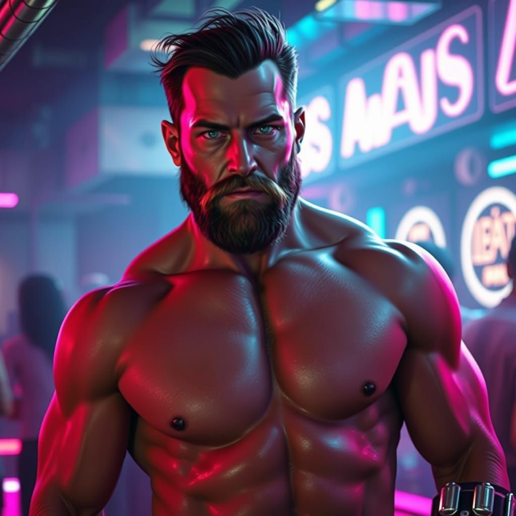 A muscular figure with a rugged beard and bionic enhancements stands shirtless, illuminated by vibrant neon lights and futuristic hues, blending dark textures with sleek high-tech elements in a dystopian atmosphere.