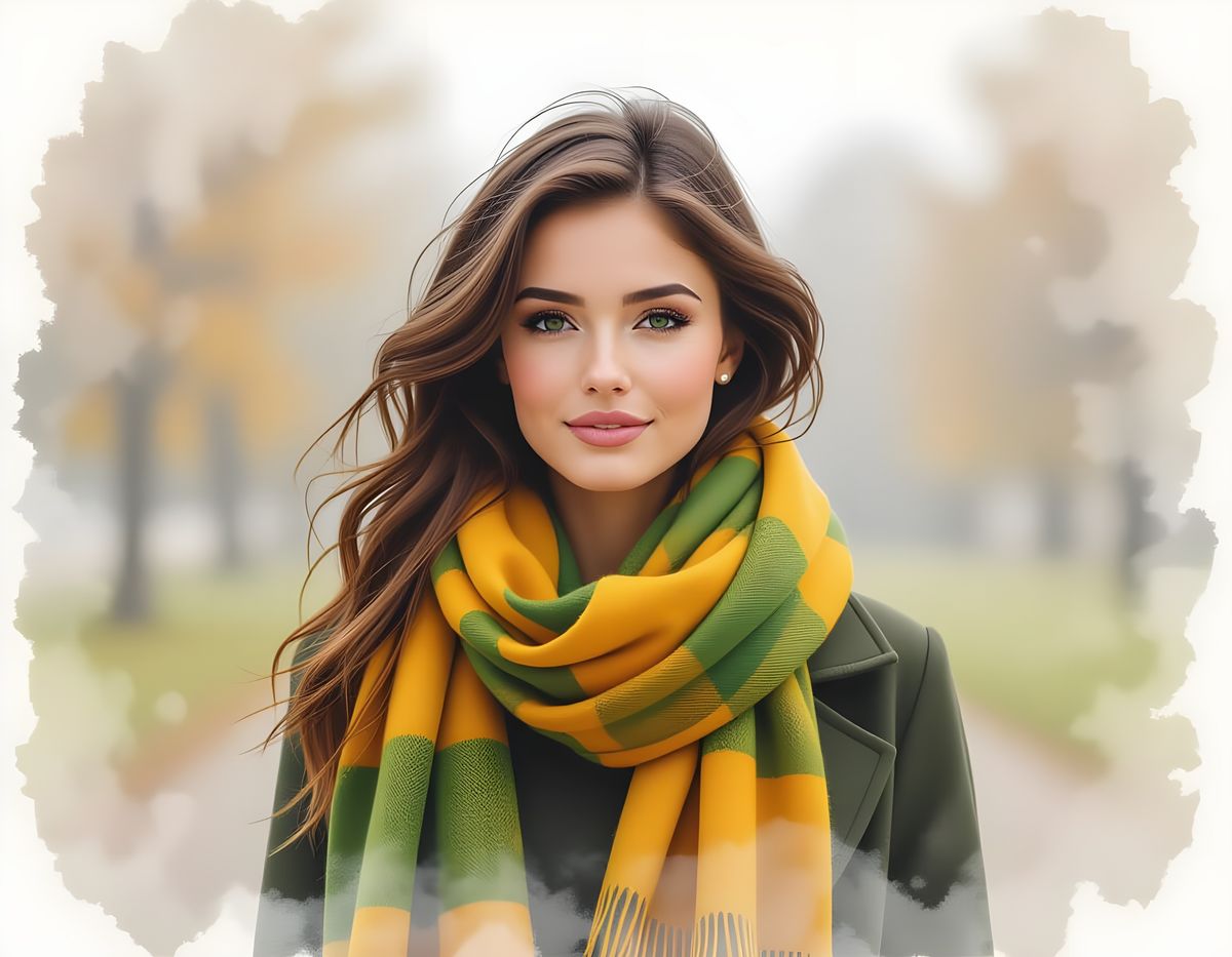 This image captures a graceful autumn scarf in shades of green and yellow, rendered with a soft, hazy watercolor effect. Professional photography techniques enhance the detailed, colorful background.