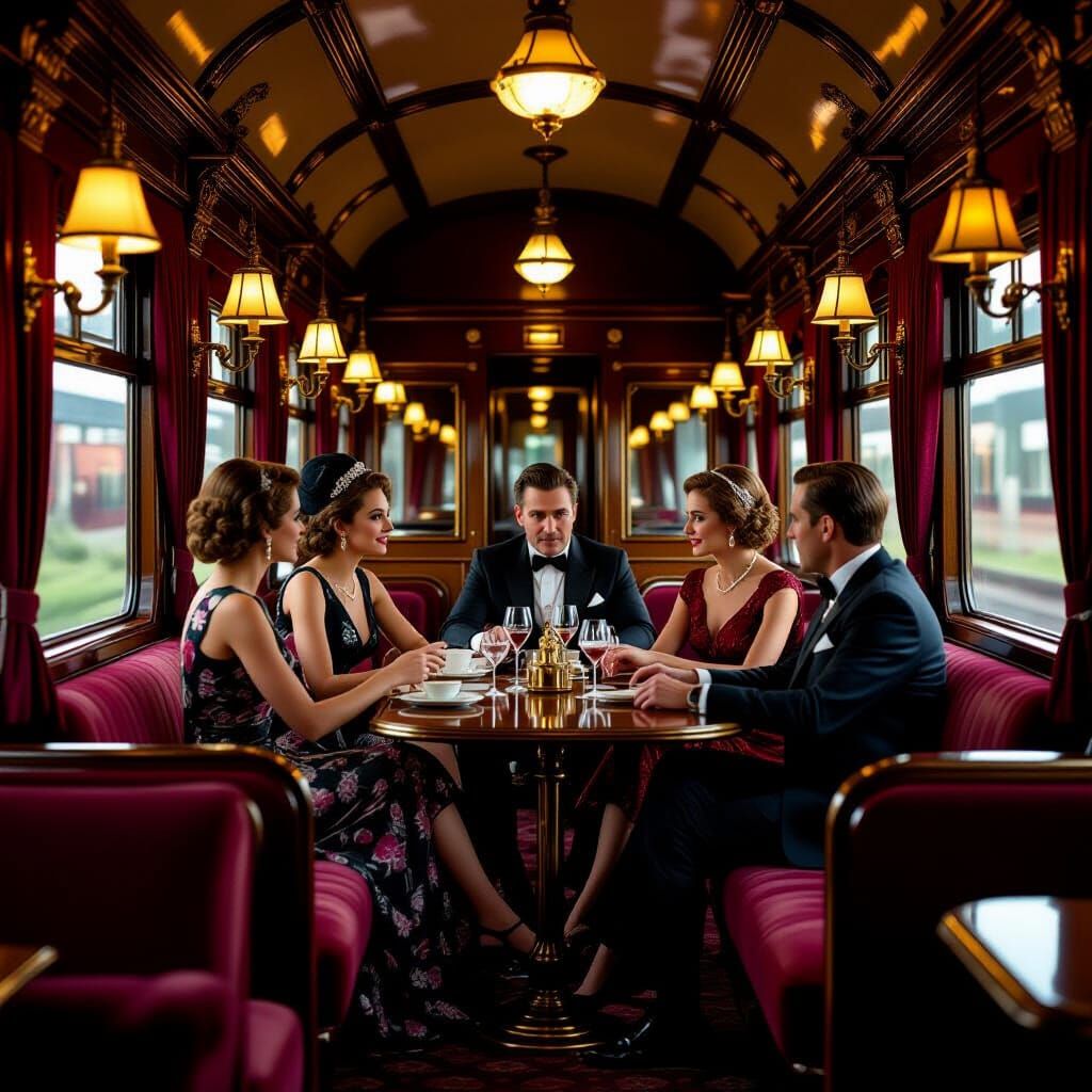 This image depicts a luxurious vintage train carriage interior with velvet seats and brass details. It captures a scene reminiscent of classic Hollywood cinema, highlighting rich textures and dramatic lighting.