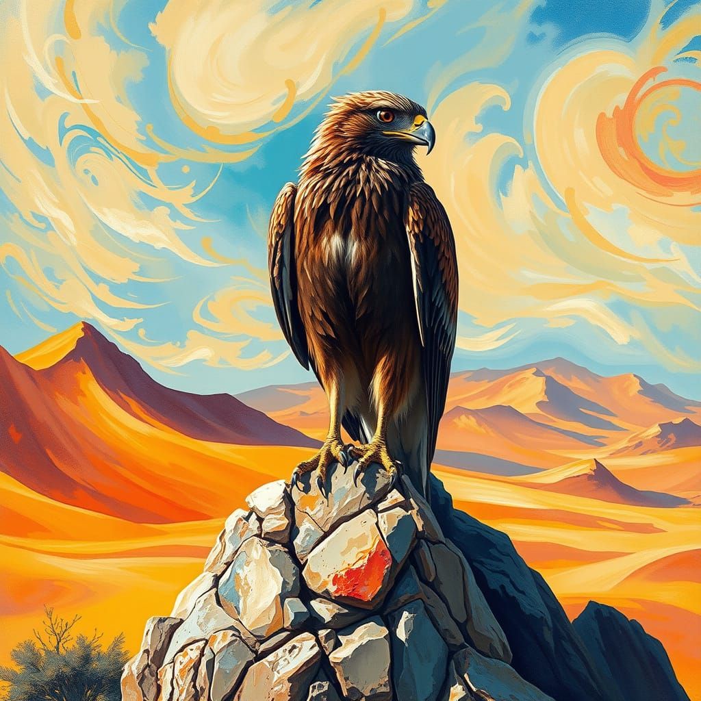 This image shows a majestic bird of prey perched atop a rugged desert rock formation, set against a vibrant, impressionist-inspired background of swirling sand dunes and azure skies. Characterized by thick, expressive brush strokes and layered gouache textures, this piece evokes the masterpieces of 19th-...