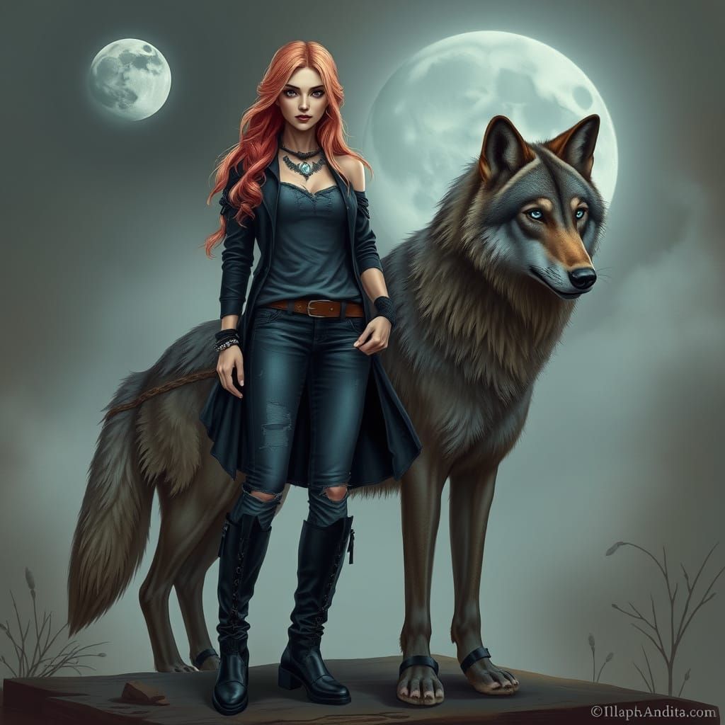 This enchanting image features a statuesque woman with moon-kissed skin and strawberry-blonde hair, dressed in layered, vintage-inspired clothing and standing alongside her wolf companion, amidst an atmosphere of mystique and futuristic elegance, with earthy tones and organic textures.