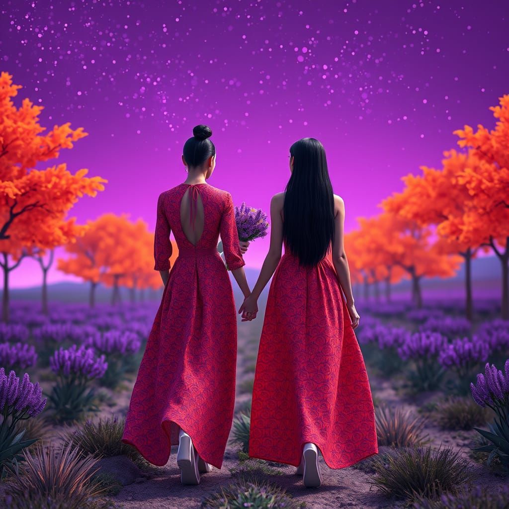 This image is a 3D rendered depiction of a fashionable couple walking through a surreal environment with purple skies and orange trees, set against a backdrop of deep shadows and intricate depth, evoking a futuristic and atmospheric aesthetic reminiscent of cyberpunk and fantasy art styles.