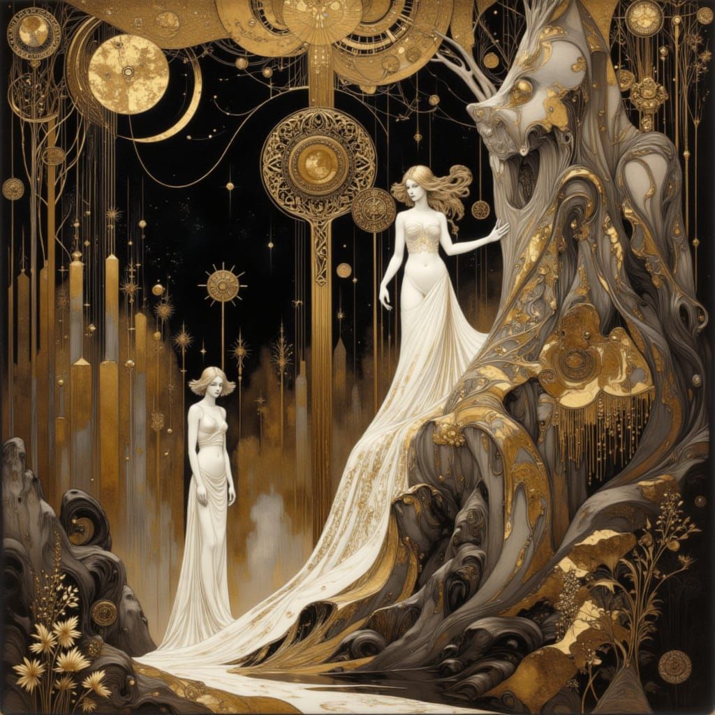 A dreamlike, surreal landscape in dark brown and iron white hues. Features ethereal figures with flowing forms, rendered with intricate detail and sensuous lines for a gothic, mystical atmosphere.
