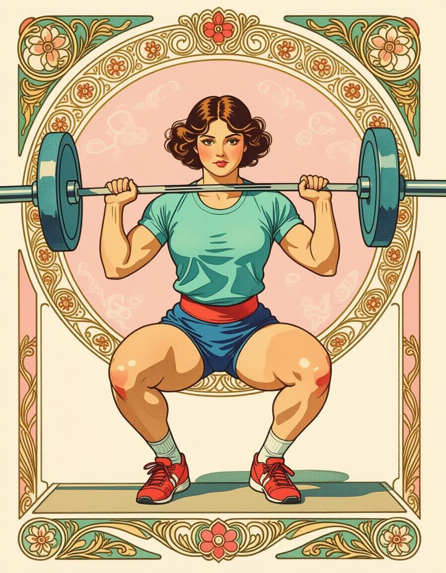 This image shows a muscular woman weightlifter in a dynamic squat. The artwork is reminiscent of Art Nouveau, featuring rich jewel tones, ornate curved details, and floral motifs in watercolor.