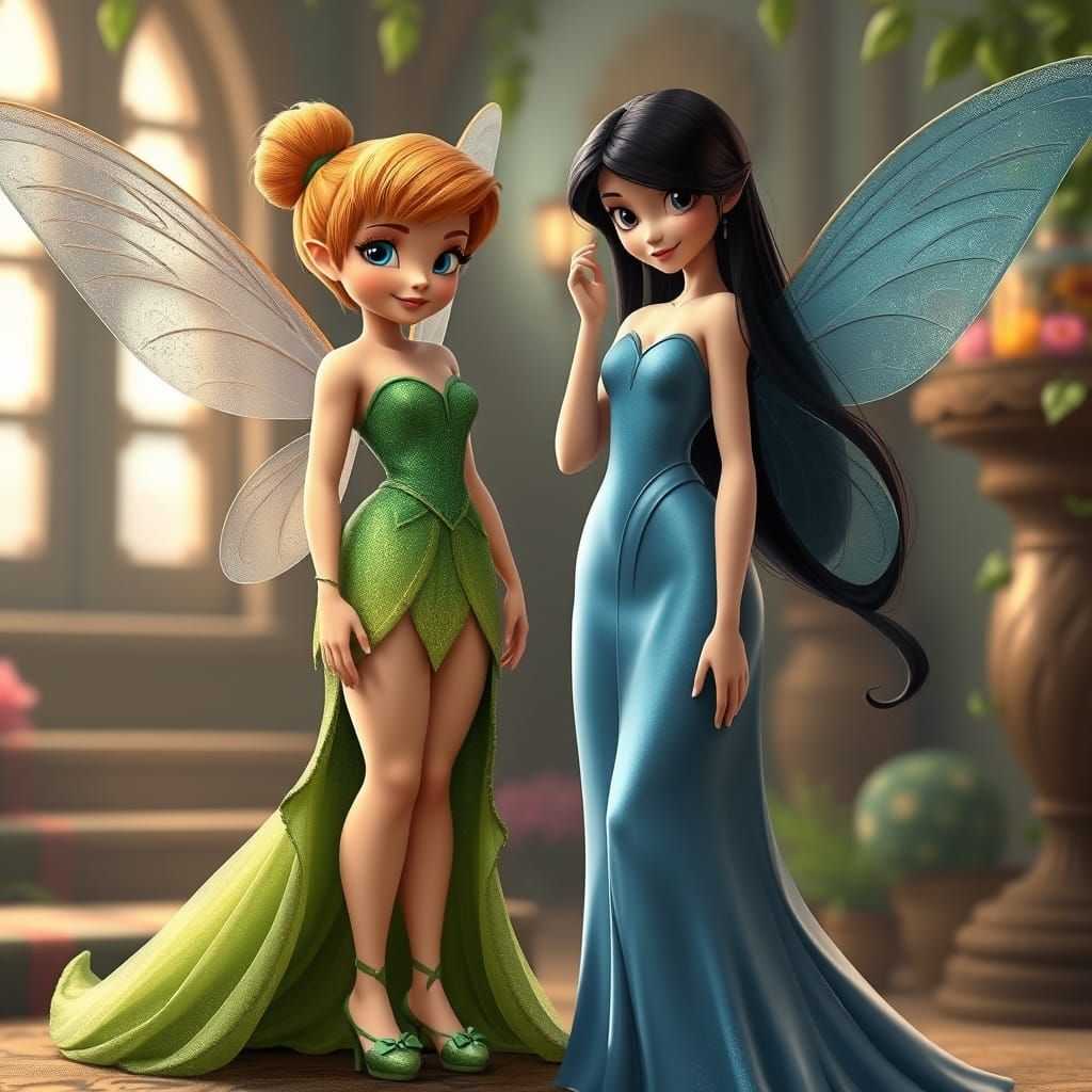 A whimsical live-action image shows Tinkerbell in a green prom dress next to Silvermist, the water fairy, with long black hair and a blue dress. The image has soft, ethereal lighting in a magical style.