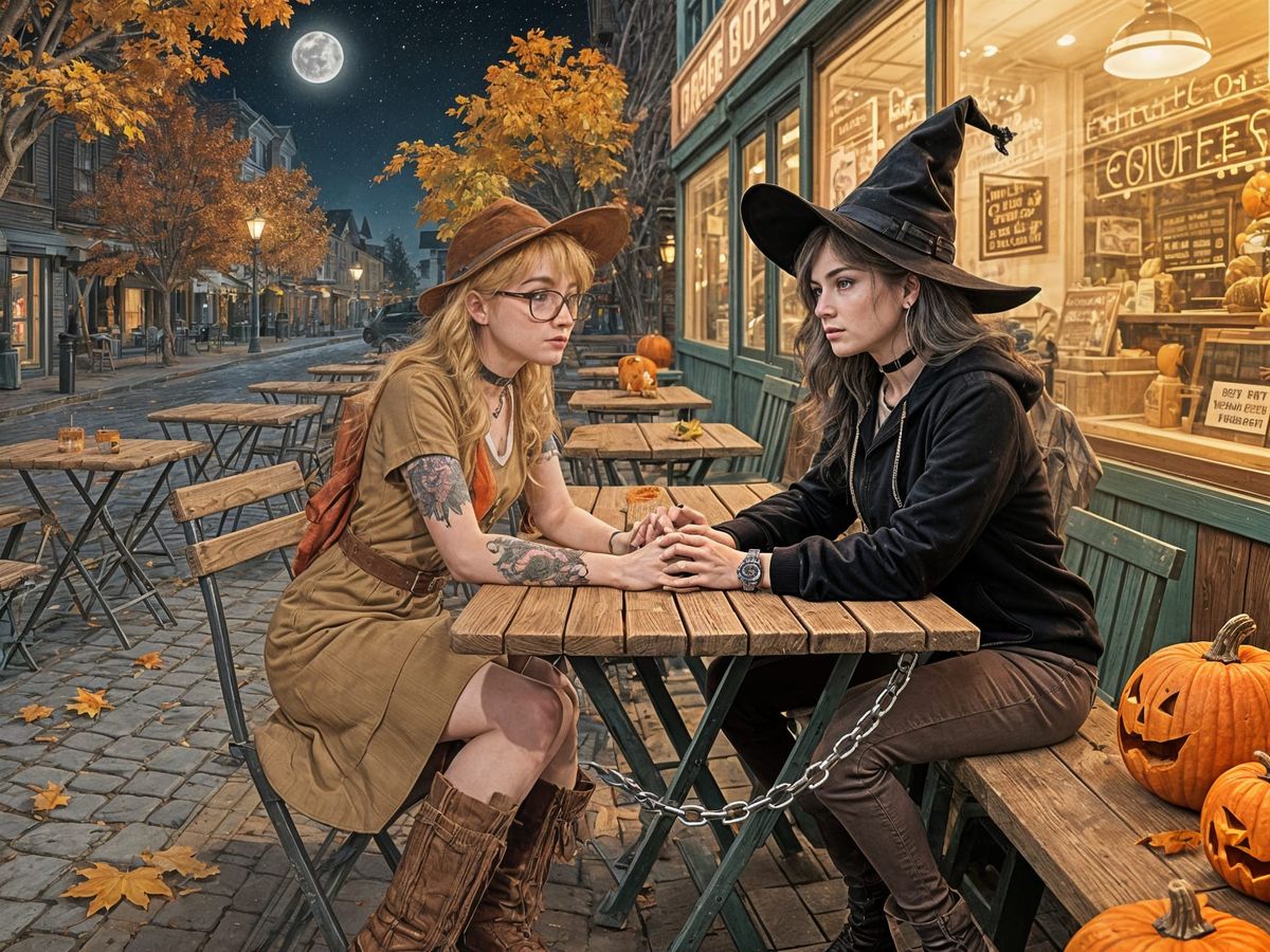 This image shows two witches holding hands at a table outside a coffee shop, on an autumn night. The scene is rendered in a realistic comic book style.