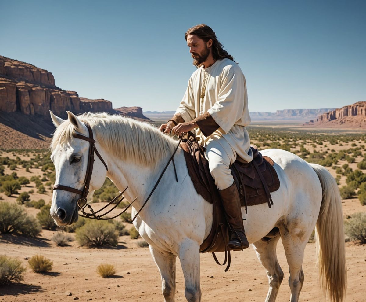 This image shows Jesus on a white stallion, gazing down at the Earth. The scene is rendered with cinematic lighting and a dramatic, hyperrealistic style.