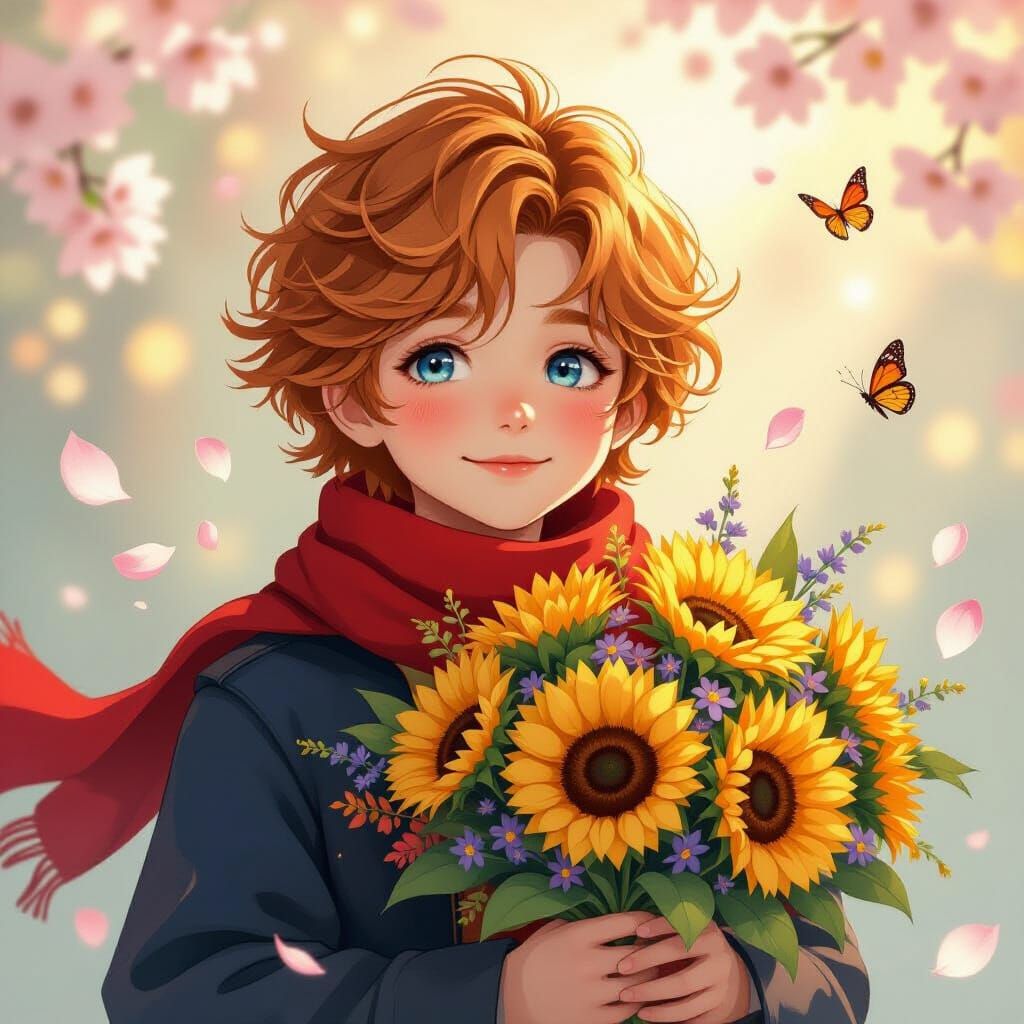 This image shows a portrait of a boy holding a bouquet of flowers. He has blue eyes and ginger hair, and is smiling gently. The art is reminiscent of art nouveau, with pastel hues and soft, ethereal lighting.