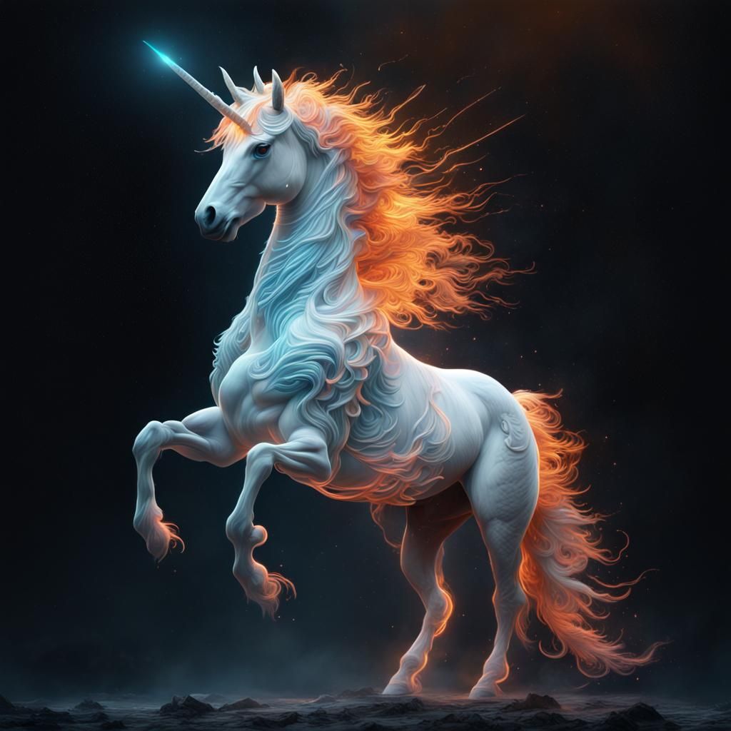 This image shows a striking bioluminescent unicorn rendered as a 3D hologram. The digital matte painting features a white and orange color palette in a maximalist aesthetic.