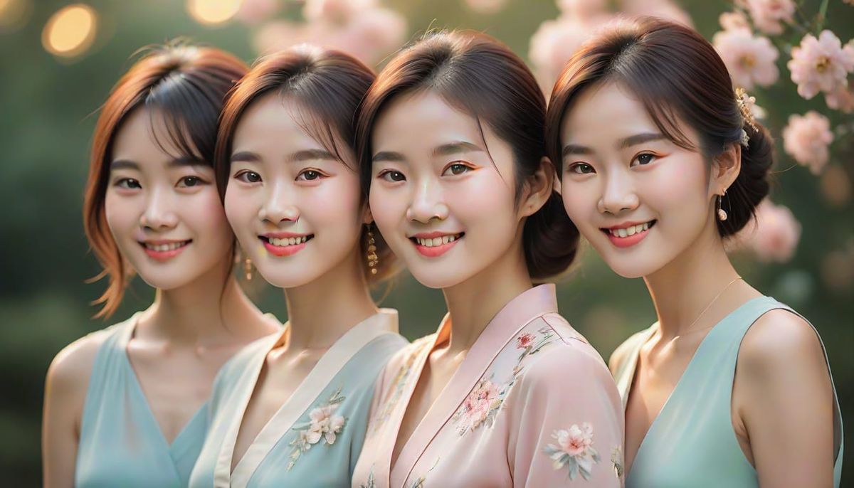 This image captures three Chinese women standing together, exuding a sense of warmth and femininity. Soft focus and gentle lighting create a natural, elegant atmosphere, while subtle bokeh and sharp facial details add depth and interest.