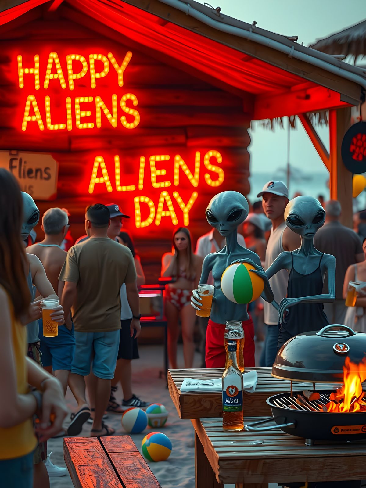 This image depicts a lively daytime beach festival with a crowd mingling, enjoying live music and barbecue. Aliens with grey skin and large eyes blend seamlessly with humans amidst vibrant neon signs and beach elements.