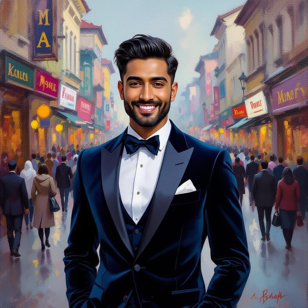 This image shows a joyful man in a navy velvet suit. Rendered as an epic impressionist oil painting with thick, textured brushstrokes and warm, golden light.