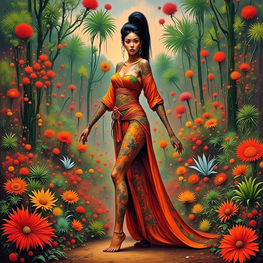 A vibrant, detailed image of a tattooed woman in silk robes, set in an oasis with palm trees and flowers. This maximalist piece evokes impressionist museum masterpieces.