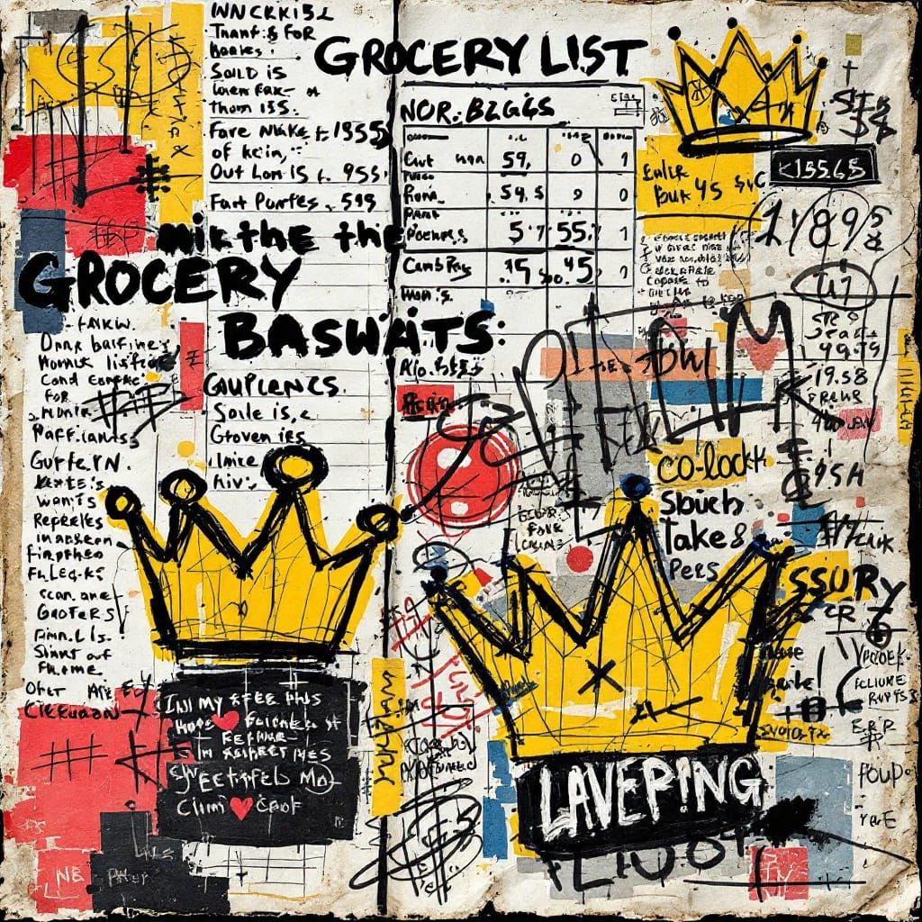 This image features a chaotic mix of grocery items, receipts, and codes, set against a distressed background, with bold typography and abstract symbols, evoking the energy and creativity of Jean-Michel Basquiat's art style.