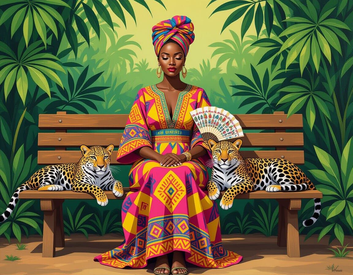 This image shows an African woman in a patterned dress sitting serenely on a bench, a leopard resting at her side. The acrylic-style artwork features decorative, flattened forms and ornamental textures.