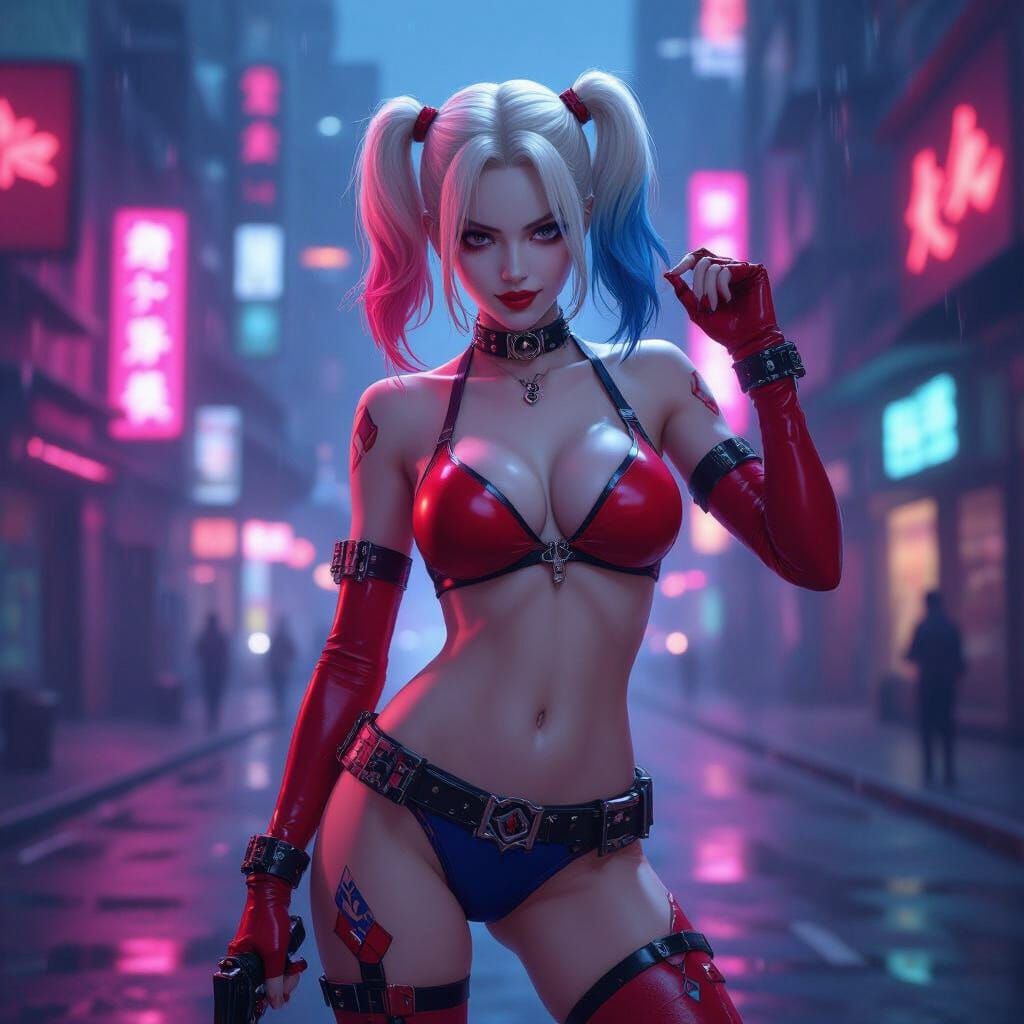 This image shows Harley Quinn in a red and blue bikini, striking a pose against a bright cyberpunk city backdrop. The character is rendered in a stylized 3D anime aesthetic, with intricate textures and high contrast.
