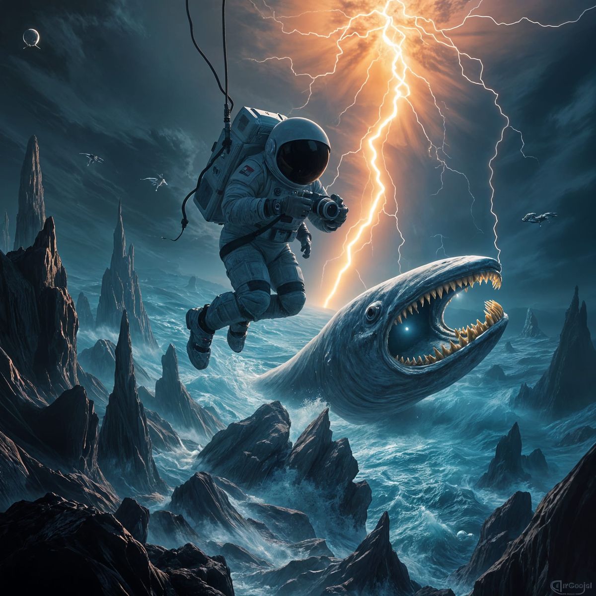 This image shows a stunning, high-contrast scene of an astronaut in midair above an alien ocean, capturing the terrifying moment a massive, bioluminescent eel-like creature breaches the surface, illuminated by a lightning storm.