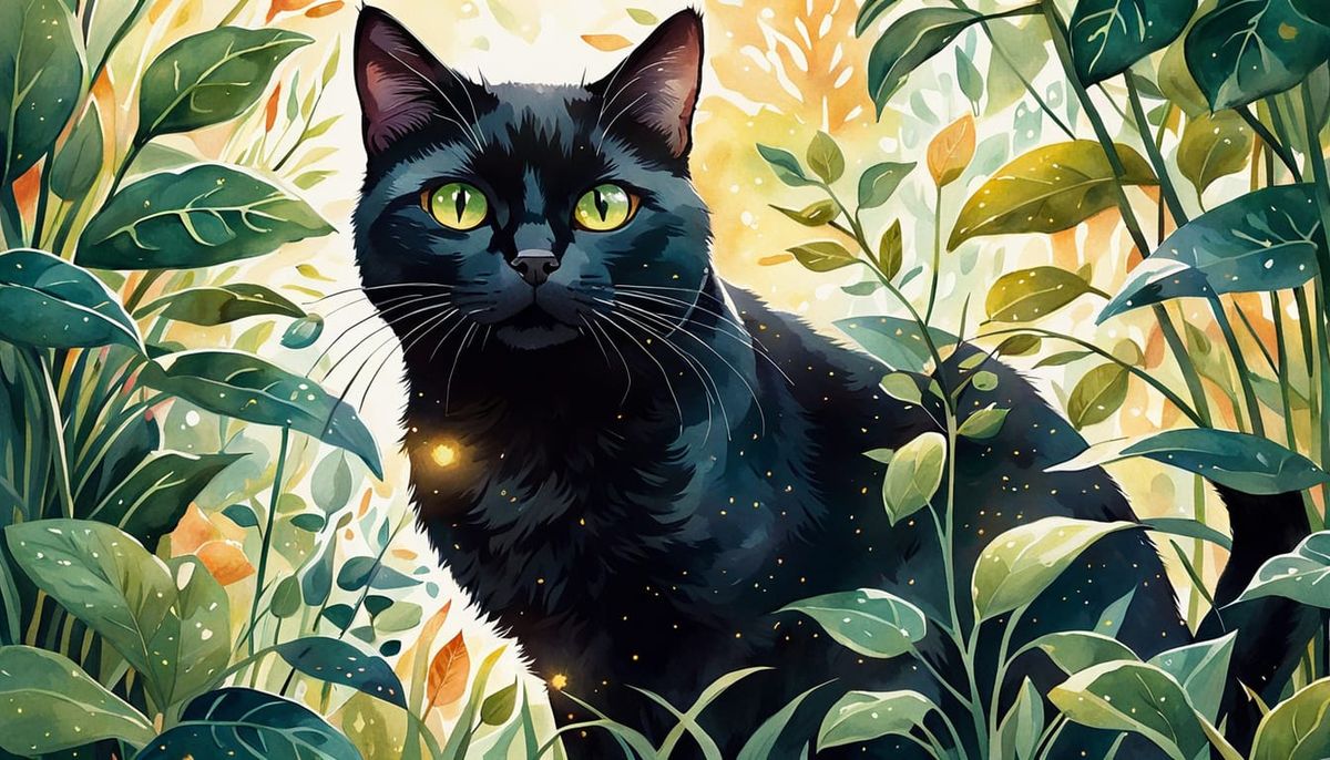 A whimsical illustration of a black cat exploring gardens and observing birds in a neighborhood setting. The image is rendered in a dreamy watercolor style with soft, golden lighting.